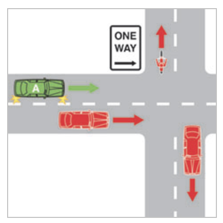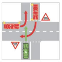 Mawtaw A a hek hi leteh. Koi mawtaw lampi awn phot ding na hiam? You are driving vehicle A. Which vehicles must you give way to?